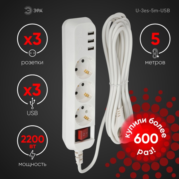 Удлинитель имеет три розетки, что позволяет подключить несколько устройств одновременно. Кабель длиной 5 метров обеспечивает удобство расположения удлинителя относительно электрической розетки, а выключатель позволяет управлять подключенными устройствами, не вынимая их из розетки. Удлинитель оснащен тремя портами USB, что позволяет одновременно заряжать три мобильных устройства, таких как смартфоны, планшеты или плееры.