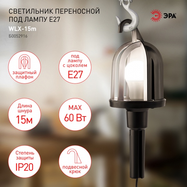Светильник переносной с крюком под лампу с цоколем E27, со шнуром питания длиной 20 метров Б0052916