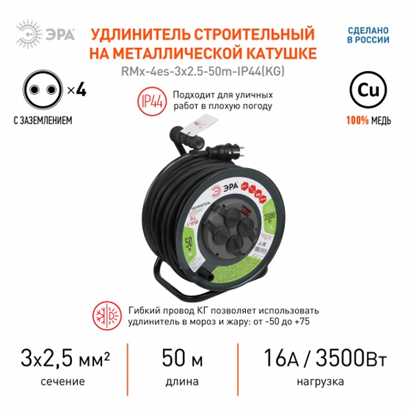 Силовой удлинитель ЭРА RMx-4es-3x2.5-40m-IP44(KG) в закрытом корпусе с заземлением, с выключателем, 4 розетки, 50 метров, КГ 3x2,5мм2, 16А позволяет легко подключить удаленное на расстоянии от стационарной розетки электрооборудование суммарной мощностью до 3,5кВт. Закрытый корпус обеспечивает удобное и безопасное использование, а также хранение удлинителя. Удобная ручка позволяет легко переносить удлинитель и устанавливать его в нужном для подключения месте.