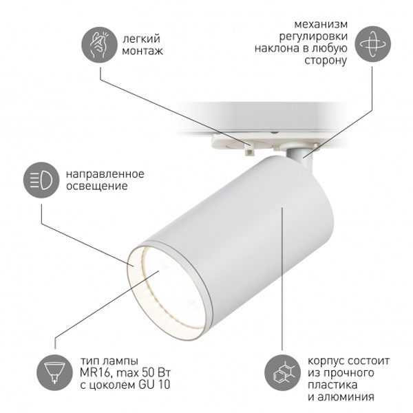 Однофазный осветительный прибор для установки на шинопровод, под ЛЕД лампу с цоколем GU10 максимальной мощностью 15 Ватт, цвет белый Б0053309