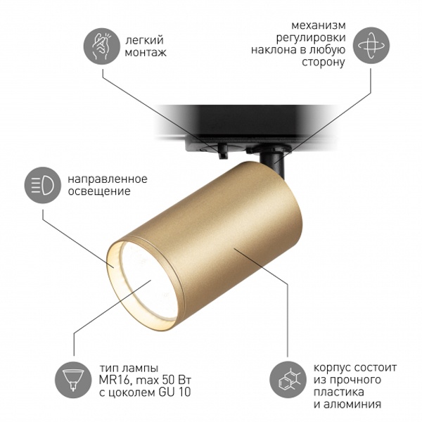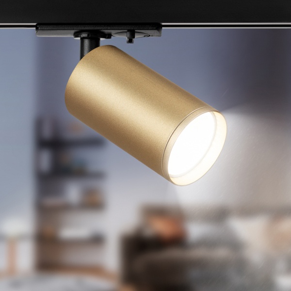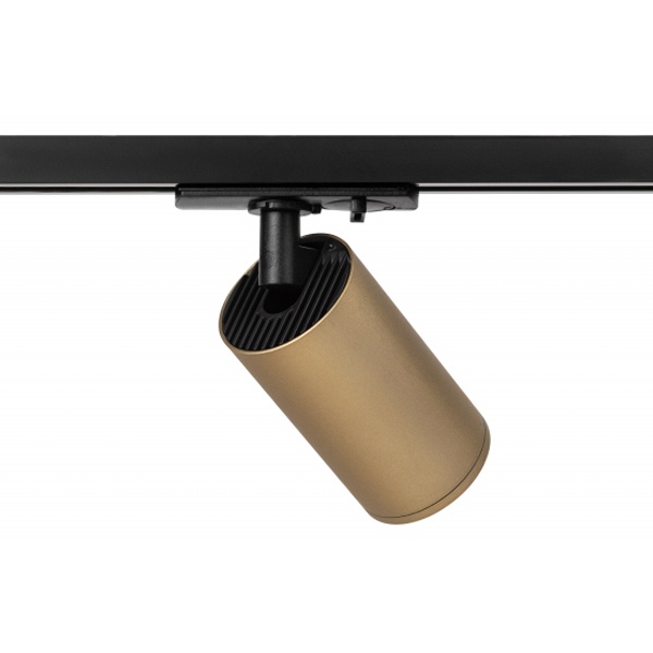 Однофазный осветительный прибор для установки на шинопровод, под ЛЕД лампу с цоколем GU10 максимальной мощностью 15 Ватт, цвет золото Б0053312