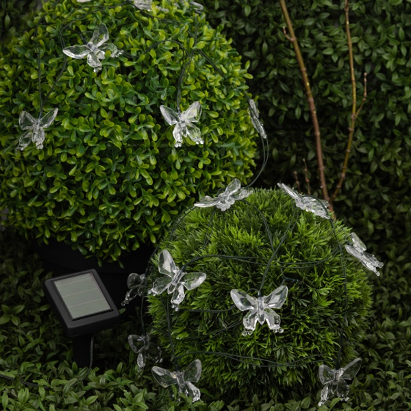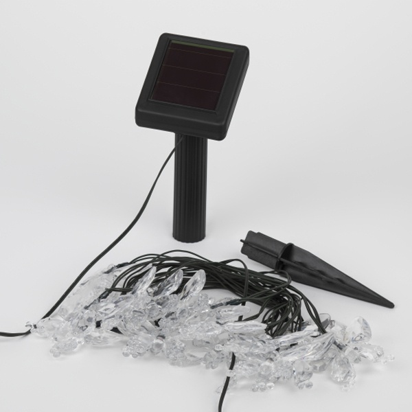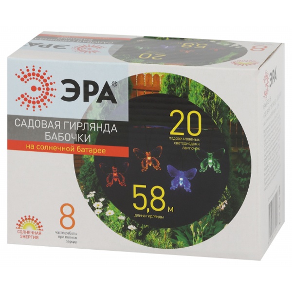 Садовая гирлянда ERASF22-15 Бабочки 5.8 м от бренда ЭРА станет симпатичным декором Вашего загородного участка! Этот уличный светодиодный светильник внесет игривости и легкости в атмосферу Вашего сада - разместите его на дереве, осветите кустарник или вход в дом. Состоит из 20 прозрачных фигурок в виде бабочек, подсвеченных светодиодами с разноцветным свечением. Гирлянда функционирует на солнечной батарее - этот тип получения энергии является наиболее экологичным, энергоемким, а также бесшумным. Питание происходит во включенном режиме, днем, а с наступлением ночи гирлянда автоматически загорается и радует Вас до 8 часов. 2 режима - постоянный и мигающий - позволят создать атмосферу праздника. Садовый светильник можно оставлять на улице в непогоду, благодаря высокой степени пыле- и влагозащиты IP44. Уличная гирлянда на солнечной батарее от компании ЭРА - оригинальный вариант для преображения площади сада.