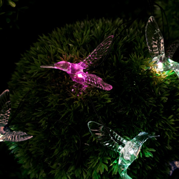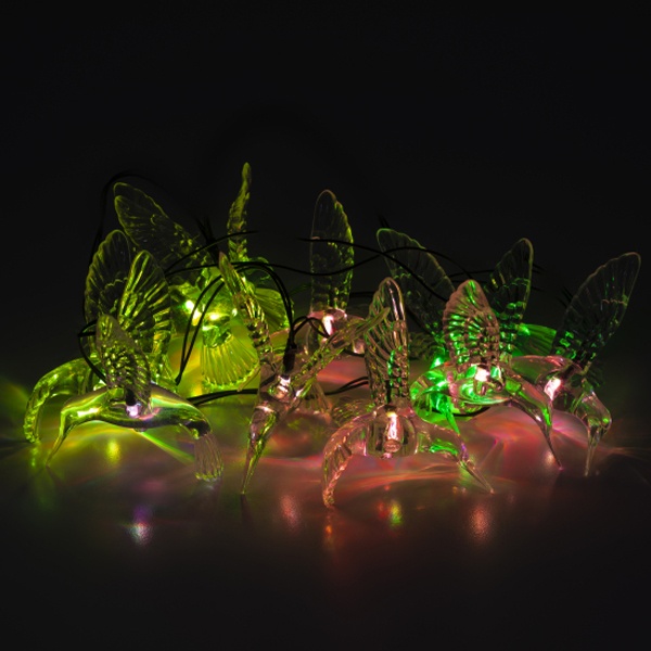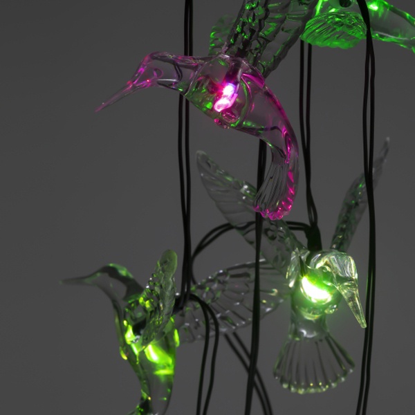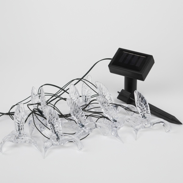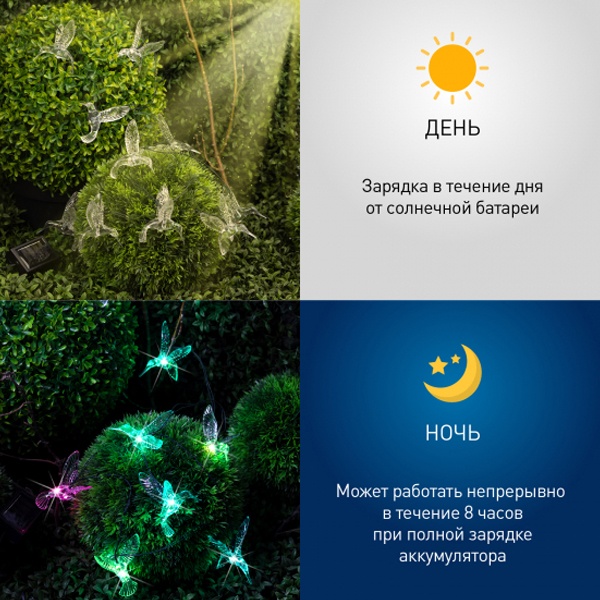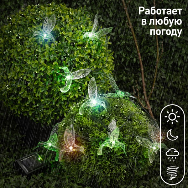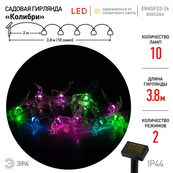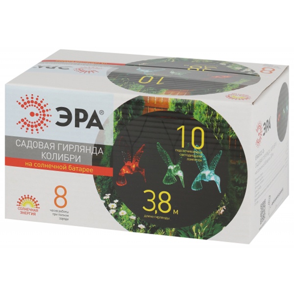 Садовая гирлянда ERASF22-26 Колибри 3.8 м от компании ЭРА станет оригинальным декором Вашего загородного участка! Этот уличный светодиодный светильник добавит атмосферу праздничности и воздушности Вашему саду - повесьте его на куст, подсветите ветви дерева или дверь в дом. Состоит из 10 прозрачных фигурок в виде колибри, подсвеченных светодиодами с разноцветным свечением. Гирлянда работает на солнечной батарее - этот тип получения энергии является наиболее экологичным, энергоемким, а также бесшумным. Питание происходит во включенном режиме, днем, а с наступлением ночи гирлянда автоматически включается и радует Вас до 8 часов своим свечением. 2 режима - постоянный и мигающий - можете менять под настроение. Садовый светильник можно оставлять на улице в непогоду, благодаря высокой степени пыле- и влагозащиты IP44. Уличная гирлянда на солнечной батарее от бренда ЭРА - выигрышный вариант для украшения территории сада.