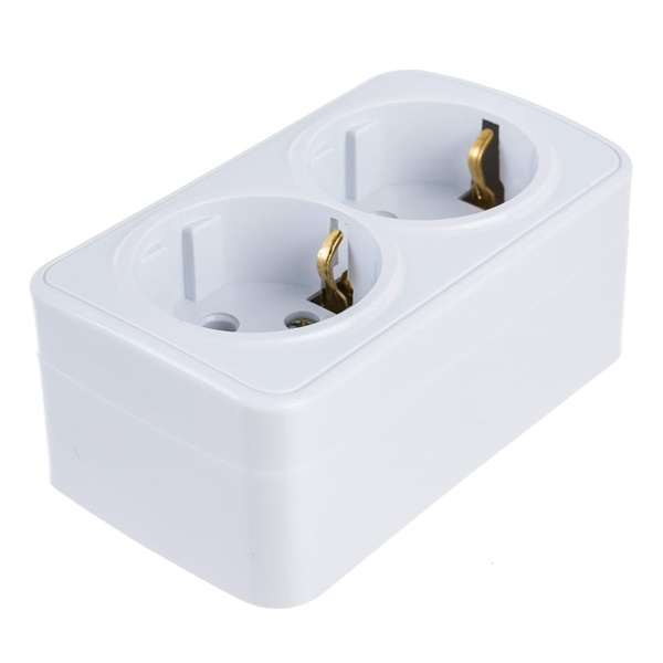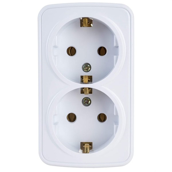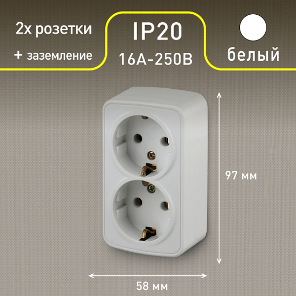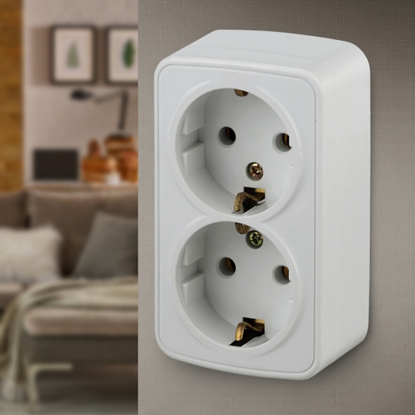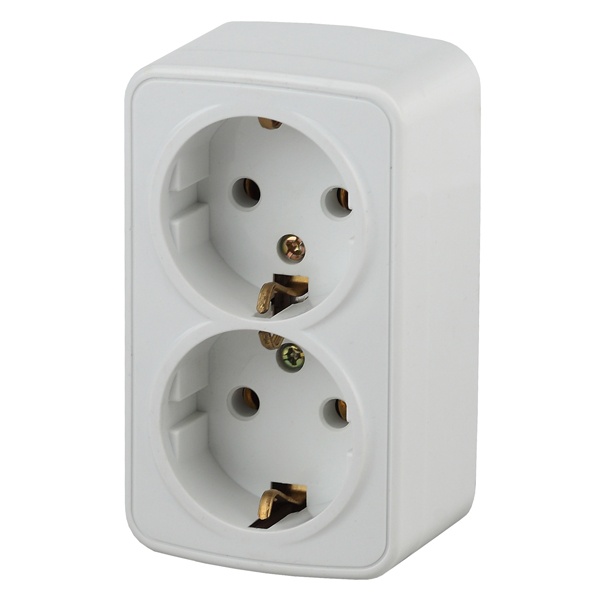 Двухместная электрическая розетка с заземляющим контактом. накладного исполнения для установки в сухих помещениях, белого цвета, Intro серии Polo. Б0053573