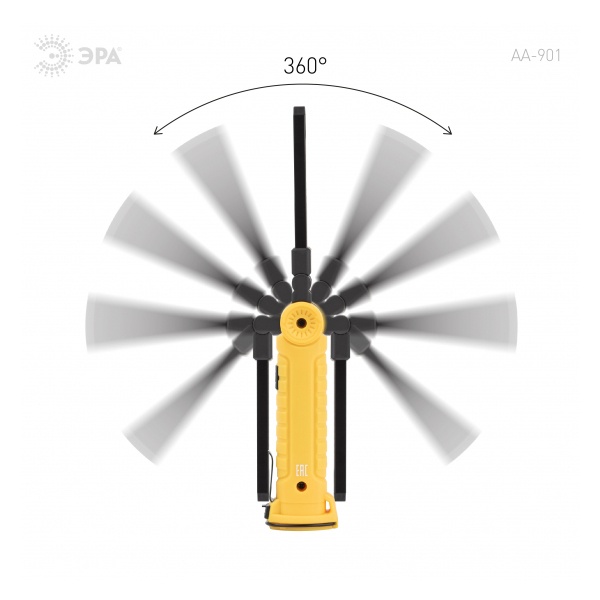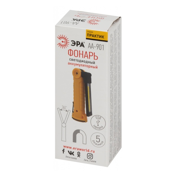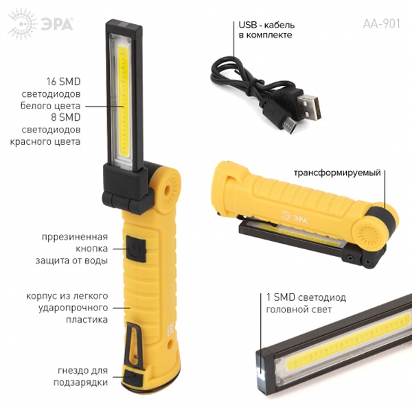 ЭРА AA-901 – многофункциональный светодиодный фонарь-трансформер с поворотной на 360° LED-платой. Оснащён 3 типами креплений: магнит, клипса, крючок. Имеет встроенный аккумулятор, подзаряжается при помощи USB-кабеля (в комплекте). Одного полного заряда хватает на 5 часов непрерывной работы. Степень защиты фонаря от влаги и пыли – IP44.