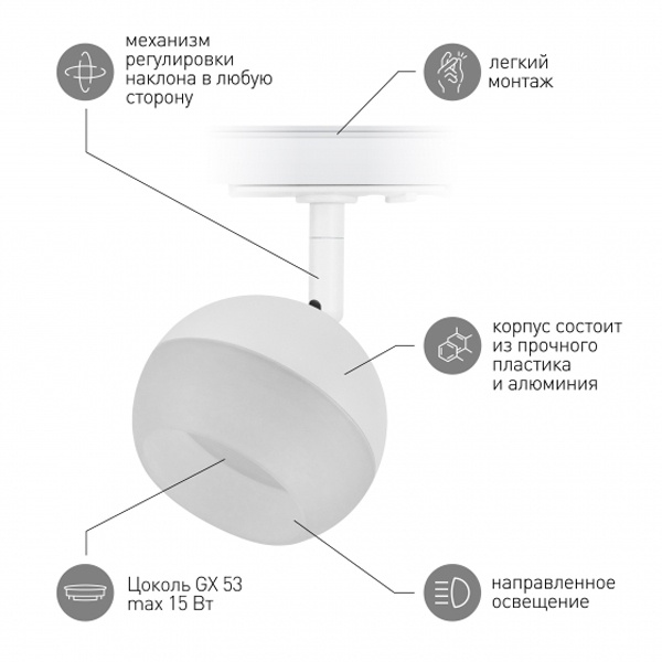 Однофазный осветительный прибор для установки на шинопровод, под ЛЕД лампу с цоколем GX53 максимальной мощностью 15 Ватт, цвет белый, с регулировкой наклона Б0054152