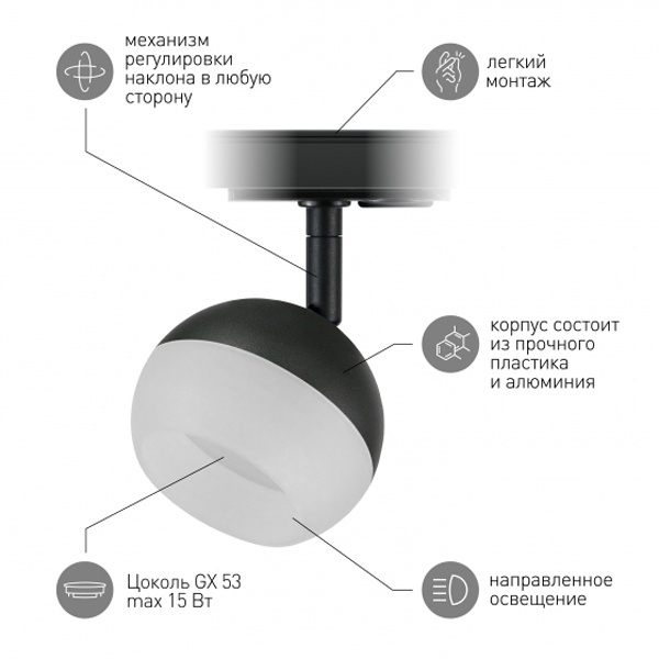 Светильники используют в качестве источника света лампу с цоколем GX53, мощностью до 15 Ватт.