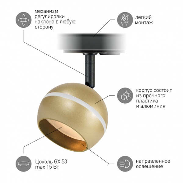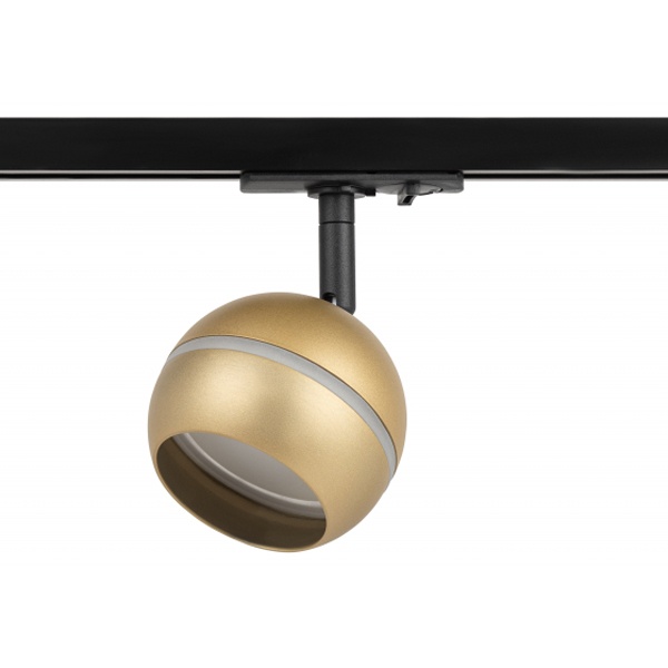 Однофазный осветительный прибор для установки на шинопровод, под ЛЕД лампу с цоколем GX53 максимальной мощностью 15 Ватт, цвет золото, с регулировкой наклона Б0054157