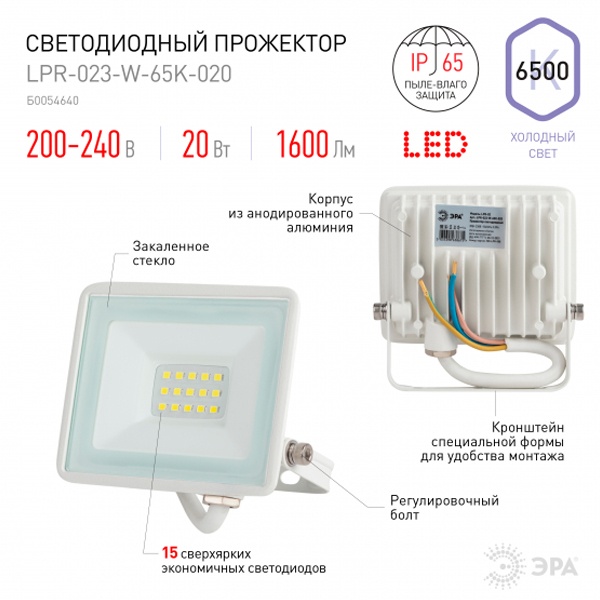 Б0054640 Прожектор светодиодный ЭРА LPR-023-W-65K-020 20W 6500K 1600Lm IP65 белый фото 2
