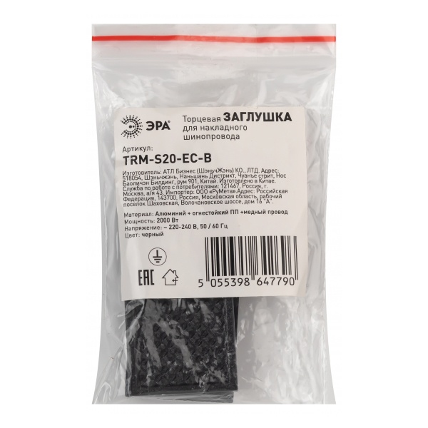 Заглушка ЭРА TRM-S20-EC-B торцевая для накладного магнитного шинопровода NOVA TRM-S20 от популярного бренда "ЭРА". Компания "Era" делает довольно качественную продукцию за не плохую цену. В комплекте две пластмассовые глухих торцевых крышки для обеих сторон шинопровода, а крепление выполнено за счет пластмассовых защелок, но это никак не ослабит крепление, ведь заглушки изготовлены из сверхпрочного ABS пластика по высшей технологии. Нужна для того, чтобы скрыть отверстие у токопровода и придать ему красивый вид, если осветительная магнитная система не будет иметь продолжение. Имеет черный цвет корпуса, поэтому убедитесь, что ваша трековая система освещения тоже черного цвета, чтобы они гармонично смотрелись. Необходим в помещениях, в которых очень часто скапливается пыль, так как если пыль попадет в шинопровод, то может помешать его работе, тем самым вызвав короткое замыкание или того хуже пожар. Чтобы все это избежать нужно лишь приобрести заглушку для шинопровода TRM-S20-EC-B от компании "ЭРА". Заглушка поможет вам избежать загрязнения токоведущих частей и продлить срок службы осветительной композиции. Заглушка подходит только для накладной серии магнитной трековой системы токопровода НОВА выпускаемой под торговой маркой "Эра".