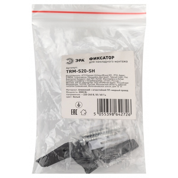 Фиксатор TRM-S20-SH для накладного магнитного шинопровода NOVA TRM-S20 от популярного бренда "ЭРА". Выполнен из сверхпрочной ABS пластмассы по специальной технологии, благодаря этому он с легкостью выдержит вес шинопровода и прослужит много лет. Цвет корпуса черный, поэтому лучше всего использовать его с черным шинопроводом, чтобы сохранить однотонность цвета. В комплекте два самореза из высококачественного металла и два пластиковых дюбеля выполненных так же из ABS пластика. Фиксатор выполнен в форме "I" поэтому скрепляет шинопровода прямо. Фиксатор используется для крепления магнитной трековой системы на горизонтальной и вертикальной поверхности, выполнен с учетом экономии места на потолке, ведь вся конструкция фиксатора прячется за шинопроводом, и все что можно будет увидеть это только боковые крепления. Для распределения нагрузки трековых токопроводов фиксатор рекомендуется крепить с шагом в 60 сантиметров и после их на поверхности профиль закрепляется в них простым поворотом рычагов. Подходит для элементов накладного магнитного осветительного токопровода серии НОВА TRM-S20.