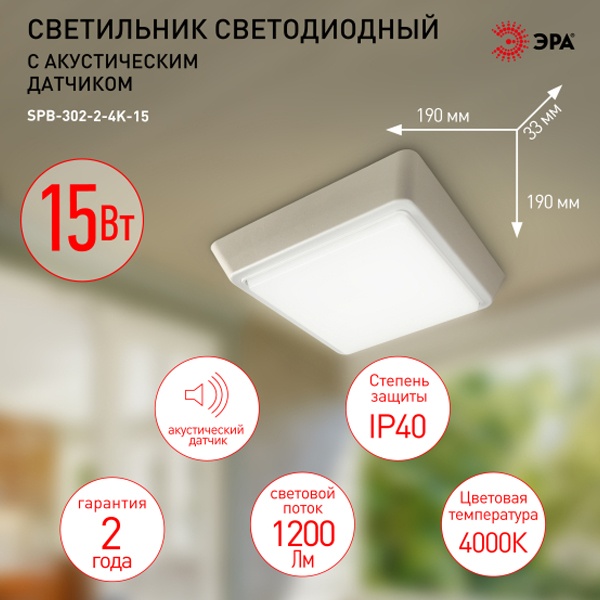 Универсальный пылевлагозащищённый LED-светильник для освещения помещений с повышенной влажностью, лестничных клеток, балконов, подвалов, технических и подсобных помещений. А также для бытового использования над крыльцом, на балконе, в подвале, в хозблоке, в гараже. Оснащен акустическим датчиком. Акустический порог активации 60дБ. Время работы после активации 40-55 сек.