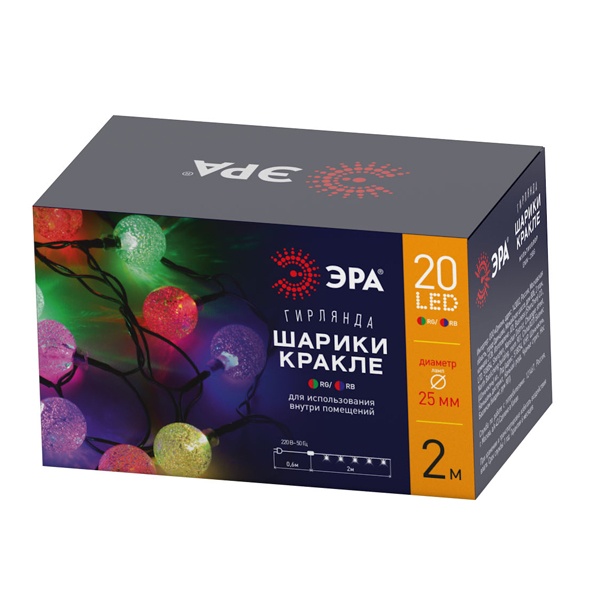 Гирлянда светодиодная "Нить" "Шарики кракле" d25мм 2м 20LED RGB IP20 220В Эра Б0055997