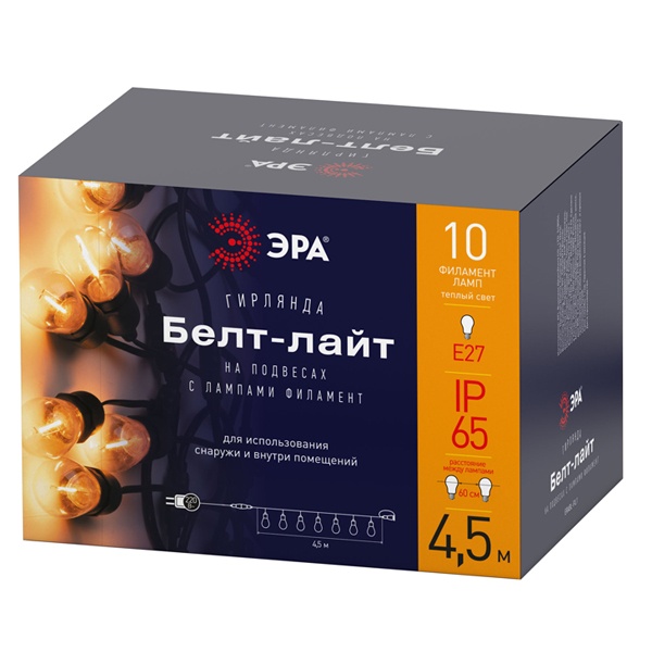 • Гирлянда Белт-Лайт ЭРА ERABL-FIL1 длина 4,5м каучук, провод 60см, 10LED теплый белый, E27, 220В IP65