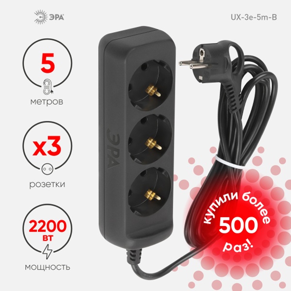 Удлинитель электрический UX-3e-5m-B с заземлением 3 розетки 5м ПВС 3х0.75кв.мм 10А черн. Эра Б0057723