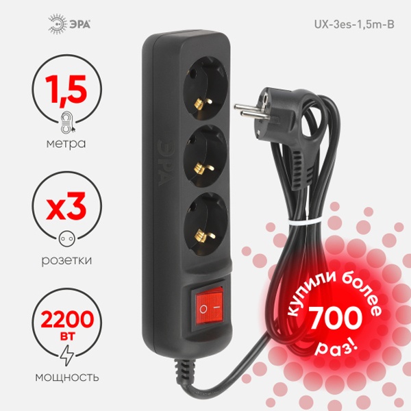 Удлинитель имеет три розетки, что позволяет подключить несколько устройств одновременно. Кабель длиной 1,5 метра обеспечивает удобство расположения удлинителя относительно электрической розетки, а выключатель позволяет управлять подключенными устройствами, не вынимая их из розетки.