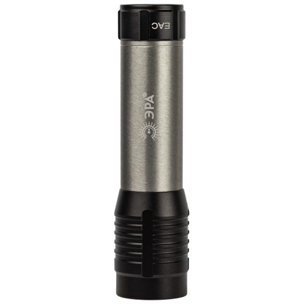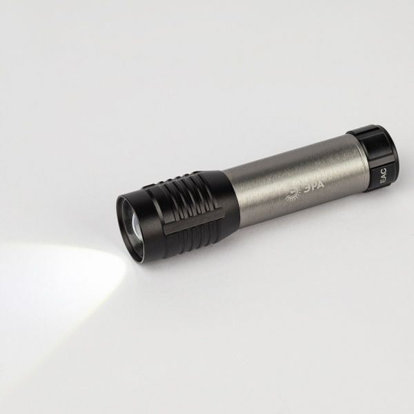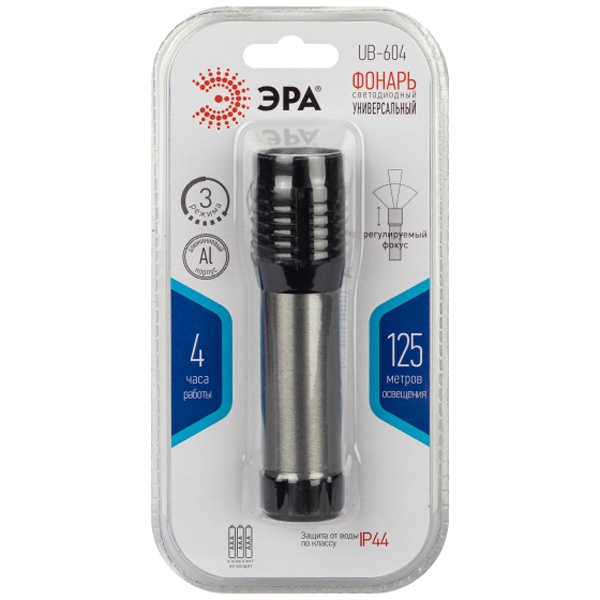 ЭРА UB-604 – ручной LED-фонарь с регулируемой фокусировкой луча. Мощность светодиодного фонаря – 5 Вт. Удобно использовать как кемпинговый фонарь, рабочий фонарь. Отличный вариант подарка для мужчины. Этот влагозащищённый фонарь (IP44) можно успешно применять на улице. Светодиодный ручной фонарь ЭРА UB-604 работает от 3 мизинчиковых батареек (ААА). В фонаре установлен мощный яркий светодиод с дальностью света до 125 метров. Световой поток – 415 Лм. Для разных ситуаций применения предусмотрены 3 режима работы: максимальная яркость, 50% яркости, стробирование.