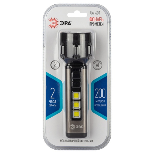 LED фонарь с боковым светильником, аккумуляторный, ЭРА UA-601 Прометей, 2 режима работы, дальность луча до 200 метров Б0058228