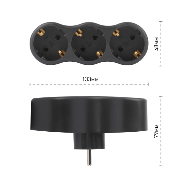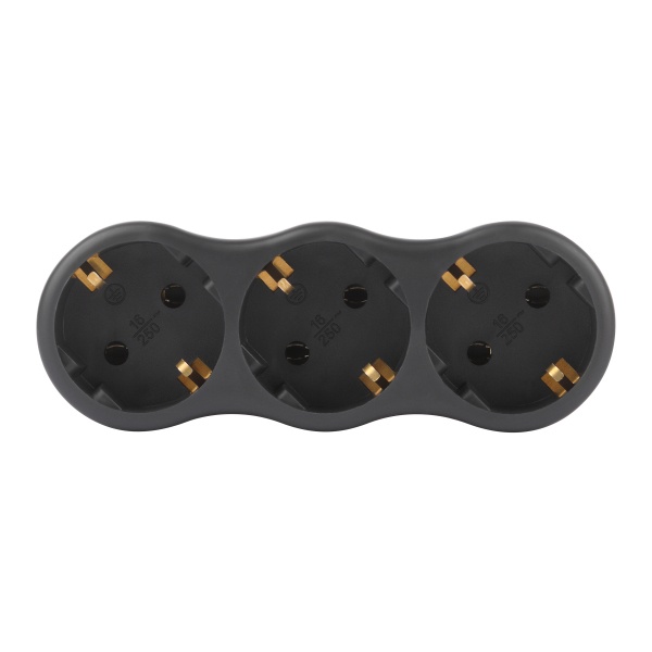 Корпус выполнен из прочного и негорючего материала, что обеспечивает дополнительную безопасность при эксплуатации. Компактная форма тройника позволяет использовать его даже в ограниченном пространстве, а наличие заземления повышает уровень защиты подключаемых устройств.