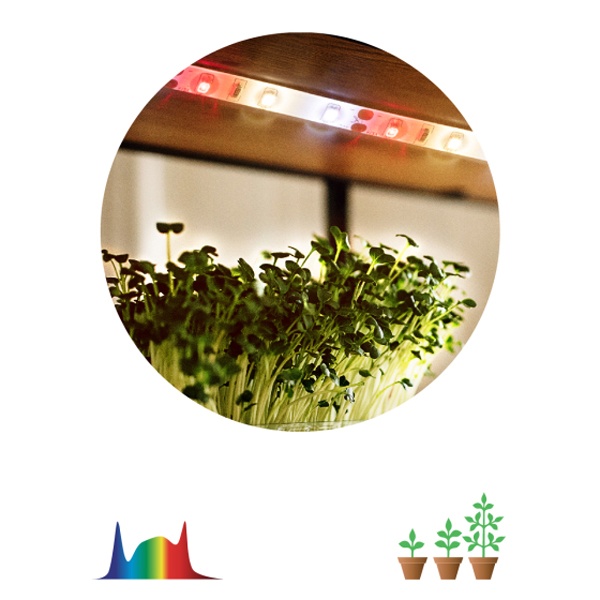 Защита от внешних воздействий: герметичная конструкция (степень защиты IP65) и эпоксидная линза с оптимальной кривой светораспределения (КСС 120°) надёжно защищают ленту от пыли, влаги и опрыскивания. Вы можете поливать растения без опасений за сохранность оборудования.