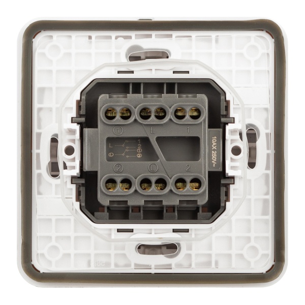Выключатель влагозащищённый 2-клавишный проходной серии Эра Эксперт накладной IP55 цвет белый скрытой установки. Номинальные характеристики 10А 250В. Выполнен из качественного поликарбоната, оснащён уникальными винтовыми клеммами для максимально качественного зажима кабеля в механизме.