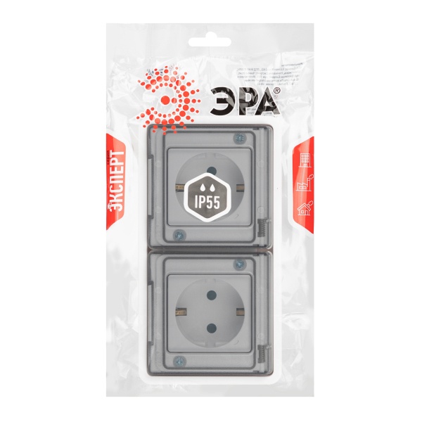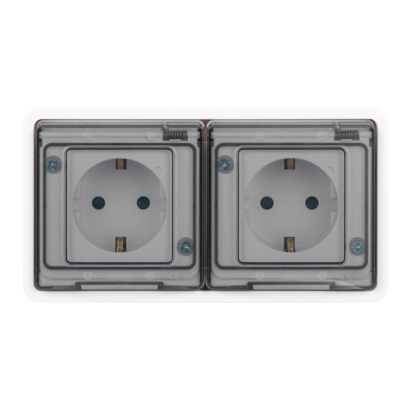 Влагозащищенная встраиваемая двухместная розетка с заземляющими контактами и защитными шторками Эра Эксперт 16 ампер на 230 Вольт, цвет белый Б0063254
