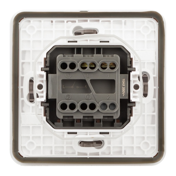 Выключатель влагозащищённый 1-клавишный проходной серии Эра Эксперт накладной IP55 цвет белый скрытой установки. Номинальные характеристики 10А 250В. Выполнен из качественного поликарбоната, оснащён уникальными винтовыми клеммами для максимально качественного зажима кабеля в механизме.