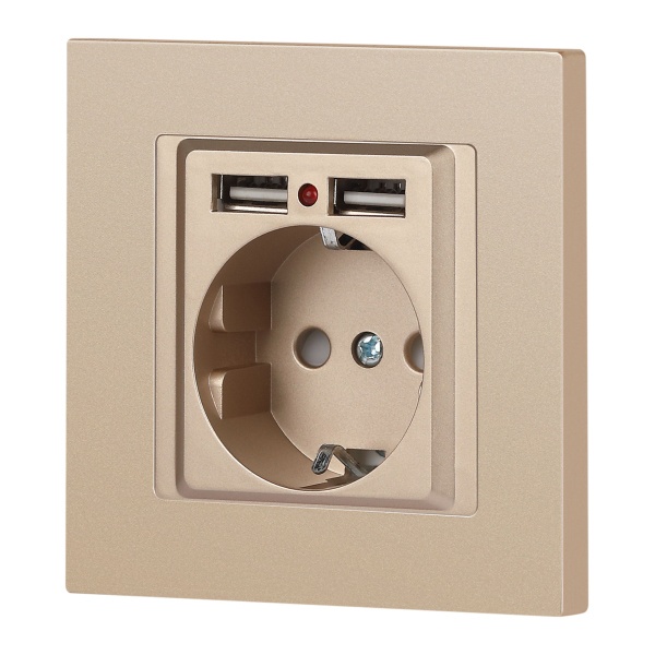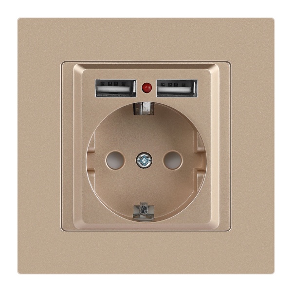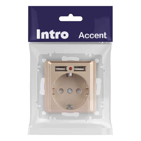 Встраиваемая электрическая розетка Интро Акцент с заземляющим контактом, шторками и двумя USB разъемами type A, цвет шампань Б0063696