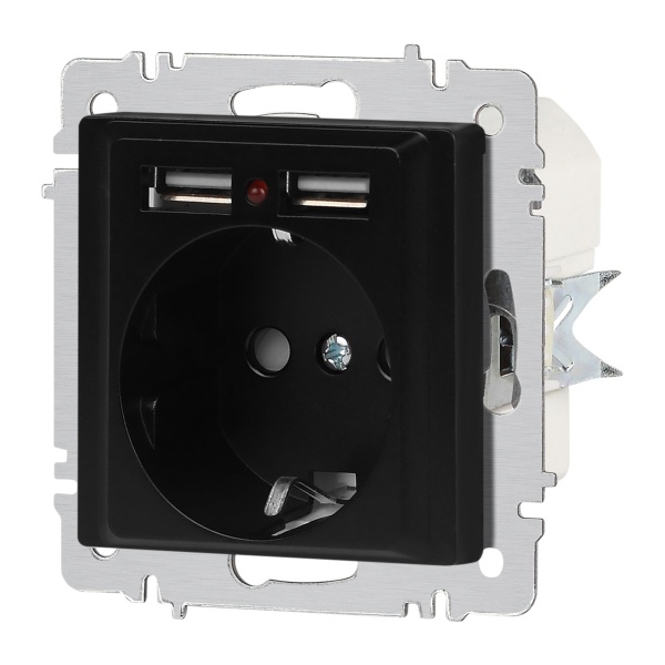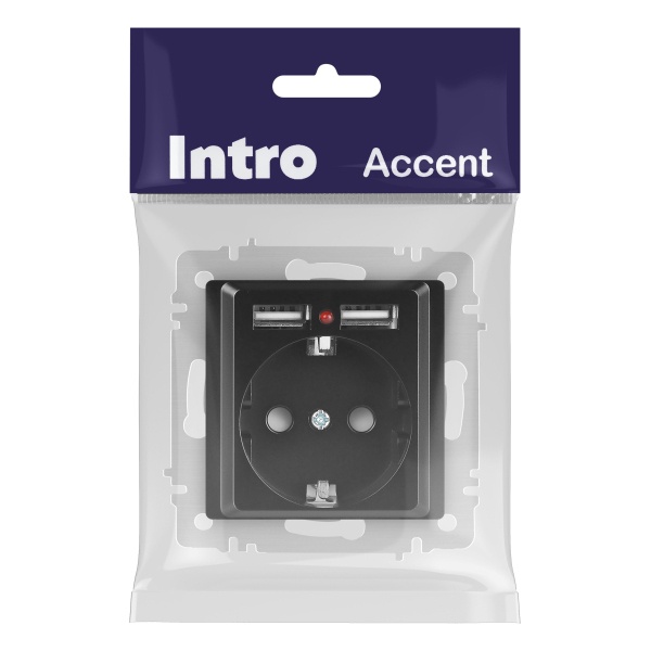 Встраиваемая электрическая розетка Интро Акцент с заземляющим контактом, шторками и двумя USB разъемами type A, цвет антрацит Б0063698