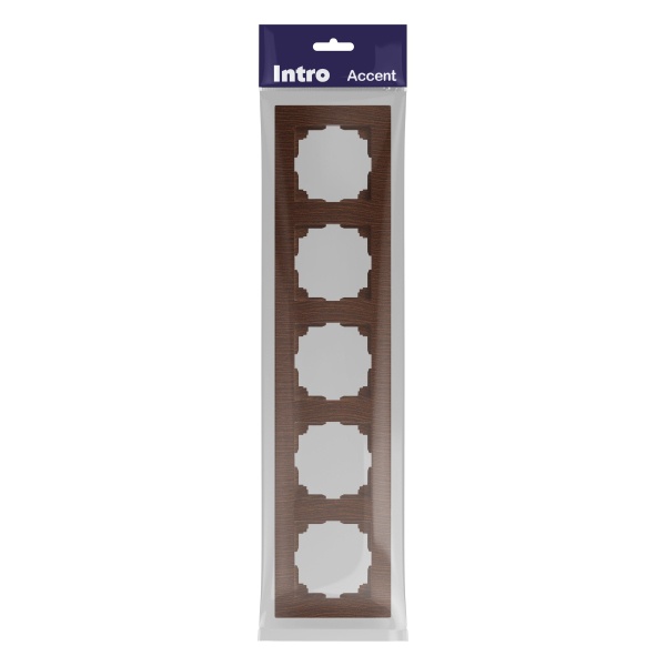 Рамка для механизмов на 5 постов Intro Accent, цвет венге – стильный элемент электрофурнитуры, который добавит интерьеру элегантность и глубину. Оттенок "венге" с выразительной древесной текстурой придает изделию благородный и роскошный вид.