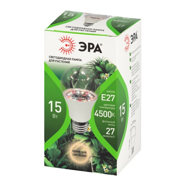 Фитолампа — это специализированное освещающее устройство, предназначенное для использования в растениеводстве. Она предоставляет растениям качественный спектр света, способствуя их здоровью и ускоренному росту. Характеристики: мощность — 15 Вт; тип цоколя — Е27; спектр излучения — полный спектр света. Форма аналогична обычной лампе накаливания. Оптимальное расстояние до листьев — 10-25 см. Важно: при размещении лампы на высоте более 40 см ее эффективность для выращивания растений с данной мощностью будет снижена. Площадь досвечивания составляет 0,4 м2.