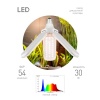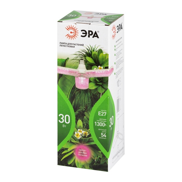 Эта модель подходит для различных типов растений, включая цветочные и зелёные культуры. Она обеспечивает равномерное освещение и минимальный нагрев, что делает её безопасной для использования в помещениях. Простота установки достигается благодаря стандартному патрону E27, совместимому с большинством ламповых светильников. Мощность в 30 Вт подходит для освещения маленьких и средних комнатных растений, а также для рассады и семян.