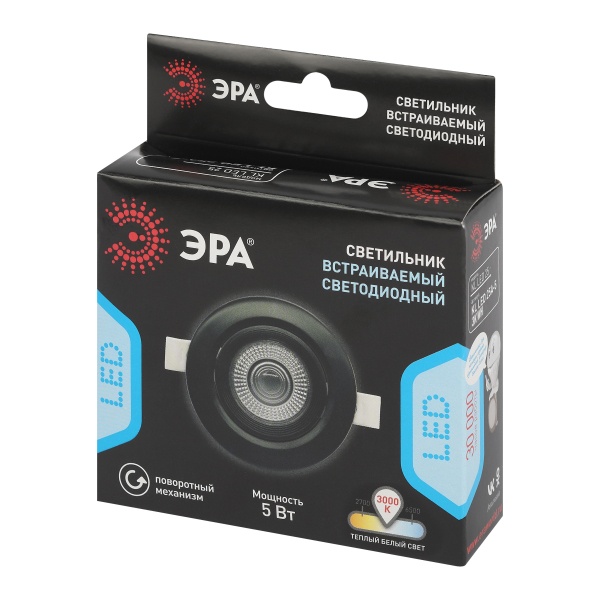 Встраиваемый светодиодный поворотный точечный светильник ЭРА черного цвета мощностью 5 Ватт, теплый белый свет Б0068164