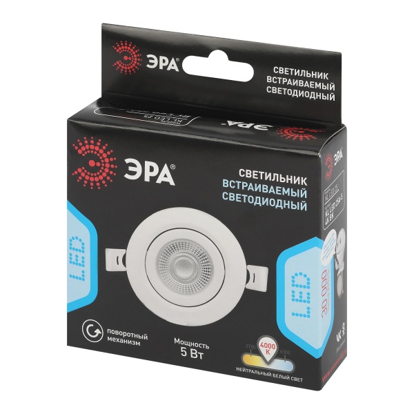 Встраиваемый светодиодный поворотный точечный светильник ЭРА белого цвета мощностью 5 Ватт, нейтральный белый свет Б0068192
