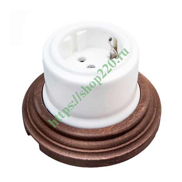 Фарфоровая электрическая ретро розетка с заземлением и деревянной рамкой, накладного исполнения, цвет Белый/Старое дерево, Бирони серия Лизетта. B1-101-01/C-17