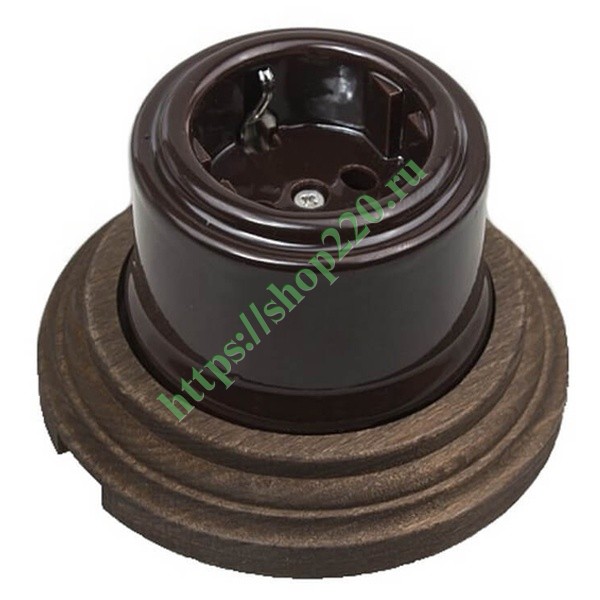 Фарфоровая электрическая ретро розетка с заземлением и деревянной рамкой, накладного исполнения, цвет Коричневый/старое дерево, Бирони серия Лизетта. B1-101-02/C-17