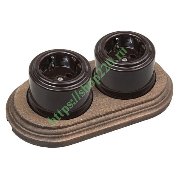 Две керамических электрических ретро розетки с заземлением и деревянной рамкой, накладного исполнения, коричневый/старое дерево, Бирони серия Лизетта. B1-101-02/CD-17