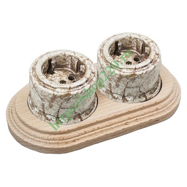Две керамических электрических ретро розетки с заземлением и деревянной рамкой, накладного исполнения, мрамор/натурель, Бирони серия Лизетта. B1-101-09/CD