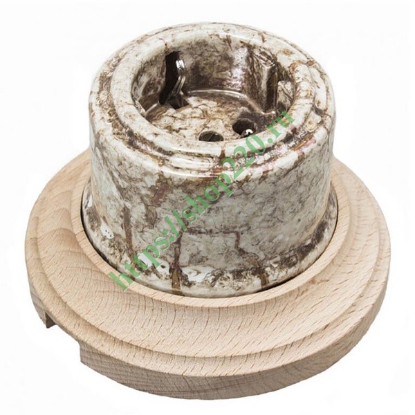 Фарфоровая электрическая ретро розетка с заземлением и деревянной рамкой, накладного исполнения, цвет Мрамор/натурель, Бирони серия Лизетта. B1-101-09/С2