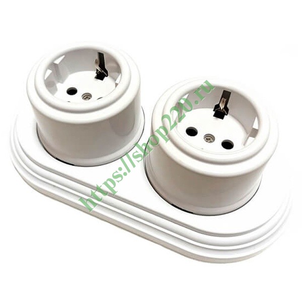 Две белых пластиковых электрических ретро розетки с заземлением и рамкой, накладного исполнения, Бирони серия Лизетта. B1-101-21/CDPL2