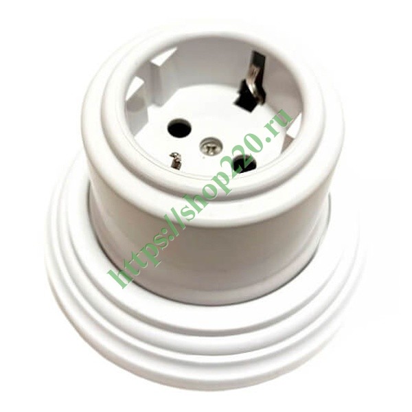 Белая пластиковая электрическая ретро розетка с заземлением и рамкой, накладного исполнения, Бирони серия Лизетта. B1-101-21/CPL2