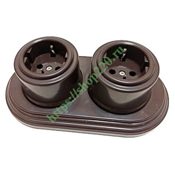 Две коричневых пластиковых электрических ретро розетки с заземлением и рамкой, накладного исполнения, Бирони серия Лизетта. B1-101-22/CDPL2