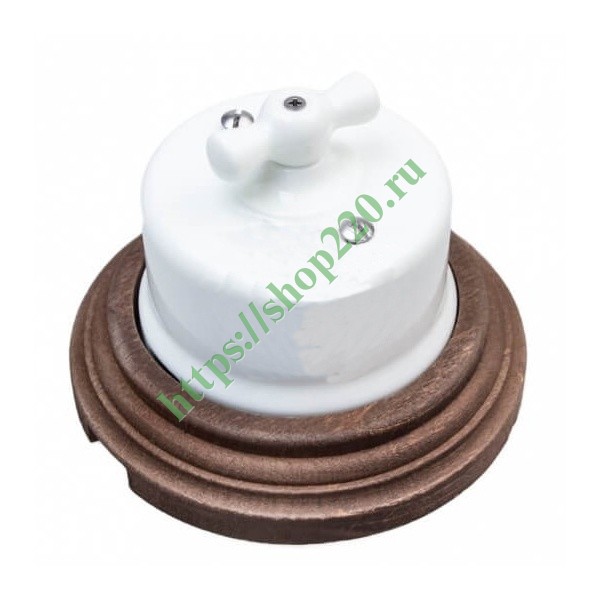Фарфоровый проходной ретро выключатель с поворотным механизмом накладного исполнения с деревянной рамкой, белый/старое дерево , Бирони серия Лизетта. B1-201-01/C-17