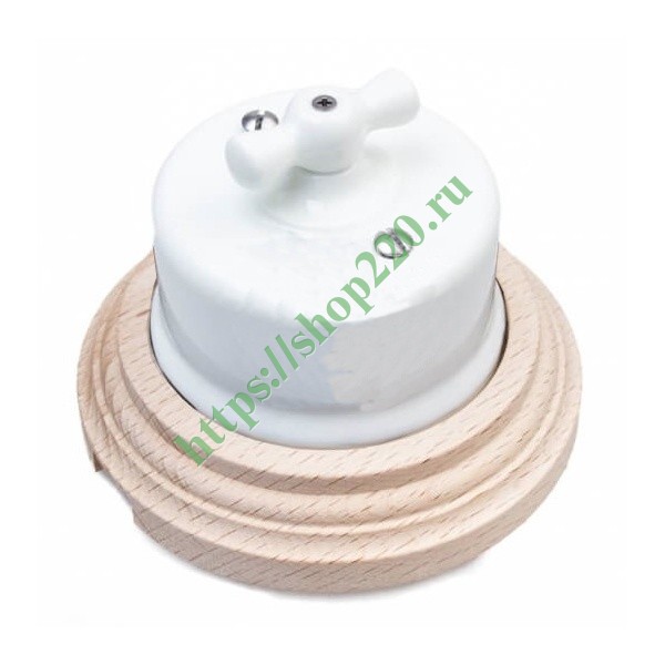 Фарфоровый проходной ретро выключатель с поворотным механизмом накладного исполнения с деревянной рамкой, белый/натурель , Бирони серия Лизетта. B1-201-01/С1