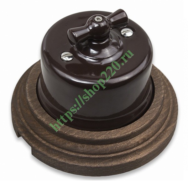 Фарфоровый проходной ретро выключатель с поворотным механизмом накладного исполнения с деревянной рамкой, коричневый/старое дерево , Бирони серия Лизетта. B1-201-02/C-17