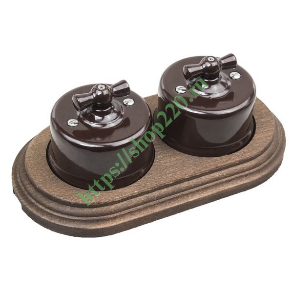 Два фарфоровых проходных ретро выключателя с поворотным механизмом накладного исполнения с деревянной рамкой, коричневый/старое дерево, Бирони серия Лизетта. B1-201-02/CD-17