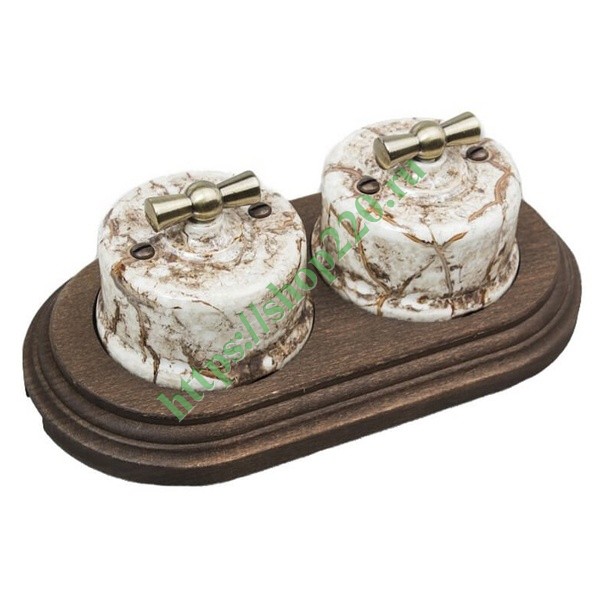 Два фарфоровых проходных ретро выключателя с поворотным механизмом накладного исполнения с деревянной рамкой, мрамор/старое дерево, Бирони серия Лизетта. B1-201-09/CD-17
