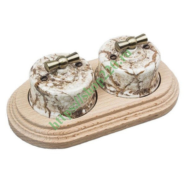 Два фарфоровых проходных ретро выключателя с поворотным механизмом накладного исполнения с деревянной рамкой, мрамор/натурель, Бирони серия Лизетта. B1-201-09/CD