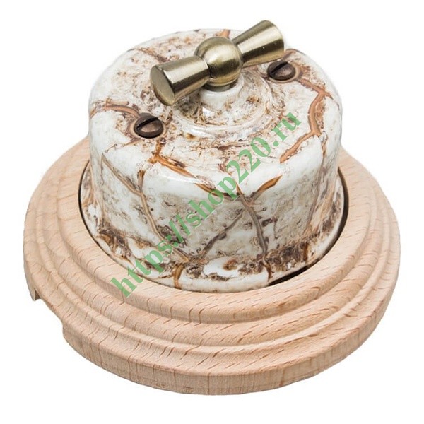 Фарфоровый проходной ретро выключатель с поворотным механизмом накладного исполнения с деревянной рамкой, мрамор/натурель , Бирони серия Лизетта. B1-201-09/С1