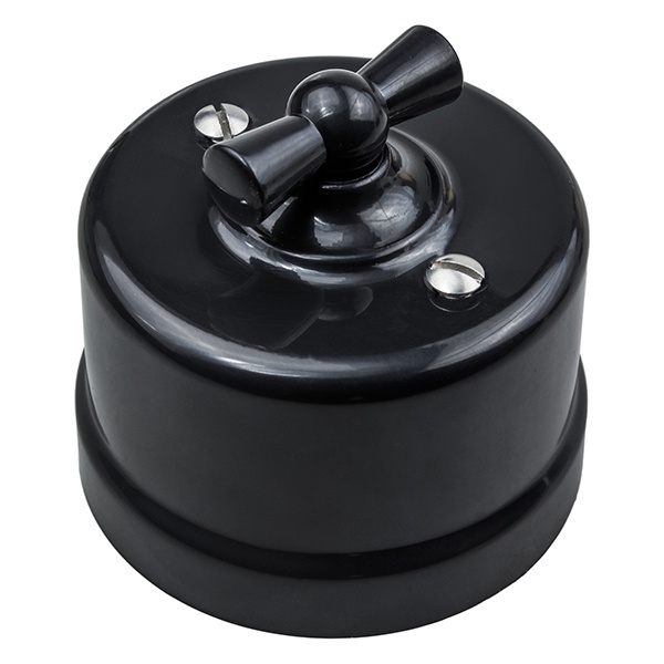 Настенный одноклавишный электрический проходной ретро выключатель с двух мест черный Бирони IP20 открытой установки B1-201-23